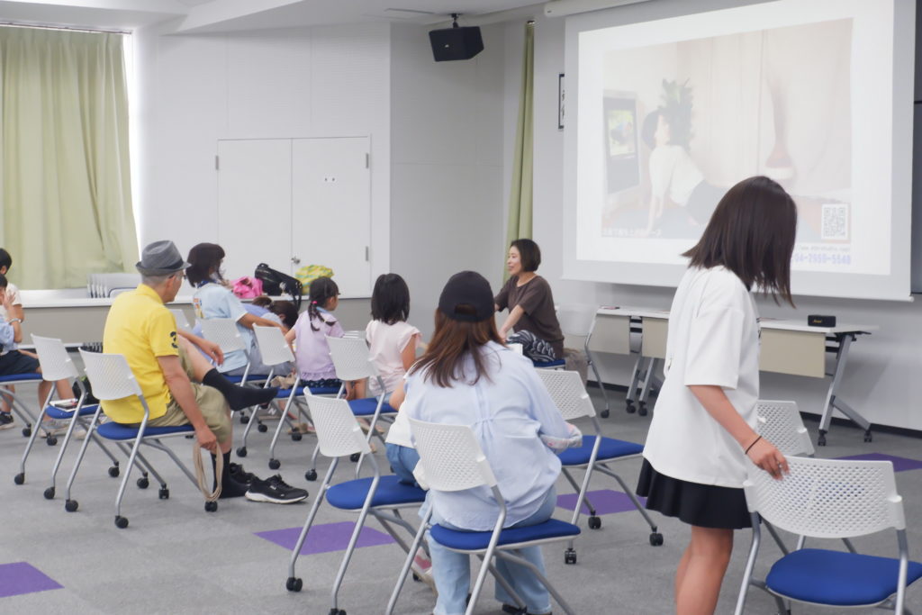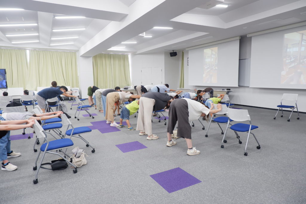 保護者向けに、ベルトを使った肩甲骨チェックや短時間のヨガ体験を提供していました。