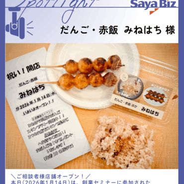 2026.01.14 【店舗オープン】だんご・赤飯「みねはち」さんが1月14日オープンしました! 本日は、Saya-Bizが昨年からご支援させていただいている事業者さまの店舗オープン日を迎え、城野ディレクターとともに現地を訪問しました。 オープンしたのは、焼きだんごとお赤飯などを販売する「みねはち」さんです。 創業セ...