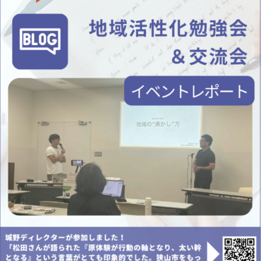 9月30日(火)、狭山市産業労働センターにて狭山まちづくり共同事業体主催【地域を「沸かす」ヒントはここにある!「狭山の沸かし屋」に聞く、地域活性化勉強会&交流会】が開催されました。 ゲストは、NPO法人フロム・ザ・スリー...