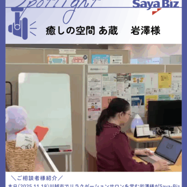 本日(2025年11月18日)川越市にある「癒しの空間 あ蔵(あぐら)」オーナーの岩澤さんがSaya-Bizにお越しくださいました。 岩澤さんは、医療現場で培った経験を活かし、丁寧なカウンセリングとお客様の身体に合わせた...